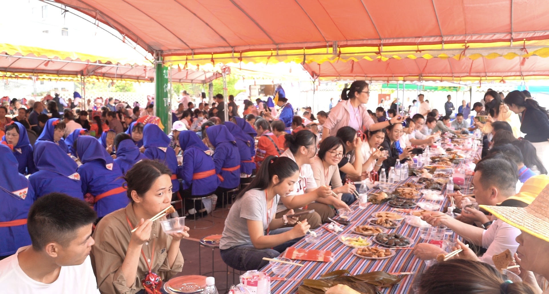 随着铺着壮锦织布的餐桌在广场摆开阵势,蓝衣壮村民们端着自酿黄酒,以《只有山歌敬亲人》的悠扬曲调挨桌敬酒。与传统的“流水席”形式相比,本次百家宴既保留共饮同食的习俗,又融入分餐公筷的文明新风。这场融合了民族元素与现代文明的文化盛宴,吸引了近千名游客的参与。